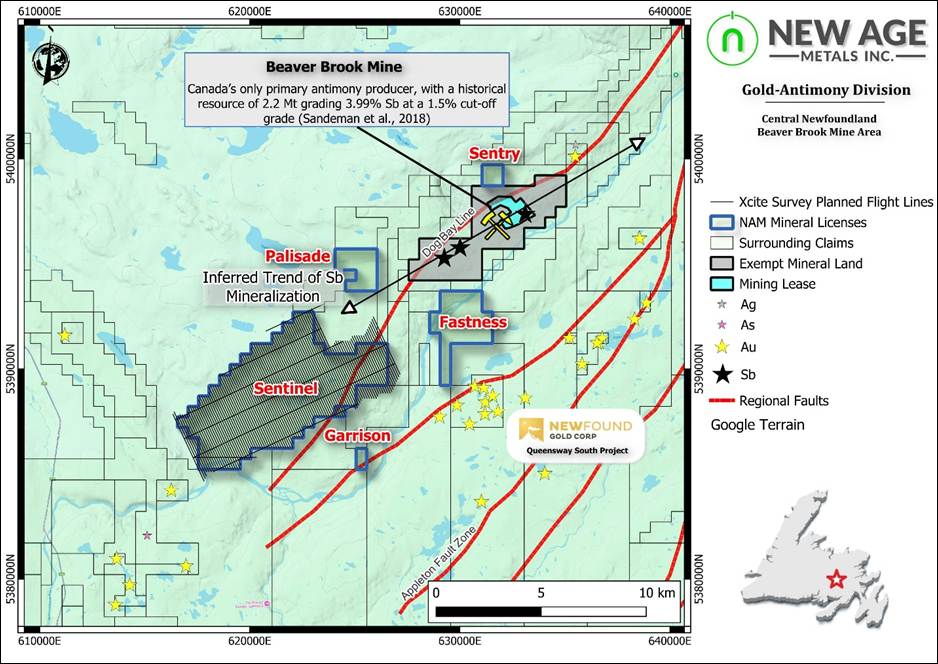 Figure 1: Overview Map of NAM’s Central Newfoundland Au-Sb Projects Showing Planned Xcite Flight Lines Over the Sentinel Property