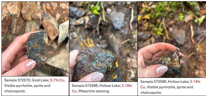 The mineral occurrences sampled, and RUSH fire-assay and multi-element assay results are shown in Figure 1 and listed in Table 1. Photographs of selected high-grade samples are shown in Figure 2. The due diligence program successfully confirmed the presence of high-grade copper mineralization on the Property, particularly at the Gold Lake and Hollow Lake Prospects. The historical Hollow Lake Prospect was not confirmed by the prospectors prior to this site visit but, while prospecting, a newly discovered outcrop was uncovered, and a grab sample assay returned 2.14% copper (Sample# 572586).