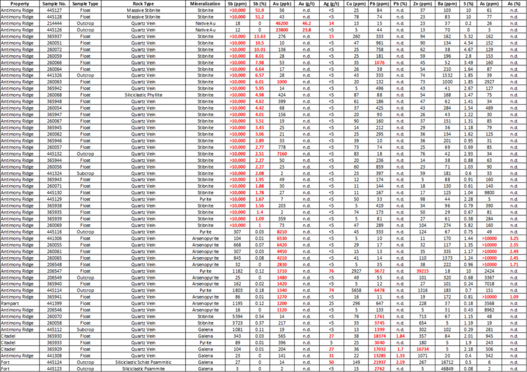 - High-grade gold assays returned up to 46.2 g/t (Sample 214444) and 23.8 g/t (Sample 445126) from grab sampling of quartz veining in the central zone of the Antimony Ridge property