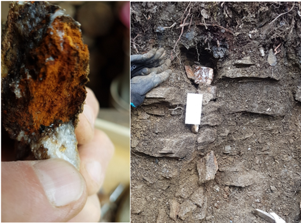 These quartz veins are oriented sub-parallel to the regional foliation, indicating that antimony mineralization is largely foliation-controlled and developed within a ductile structural fabric of the host rocks.