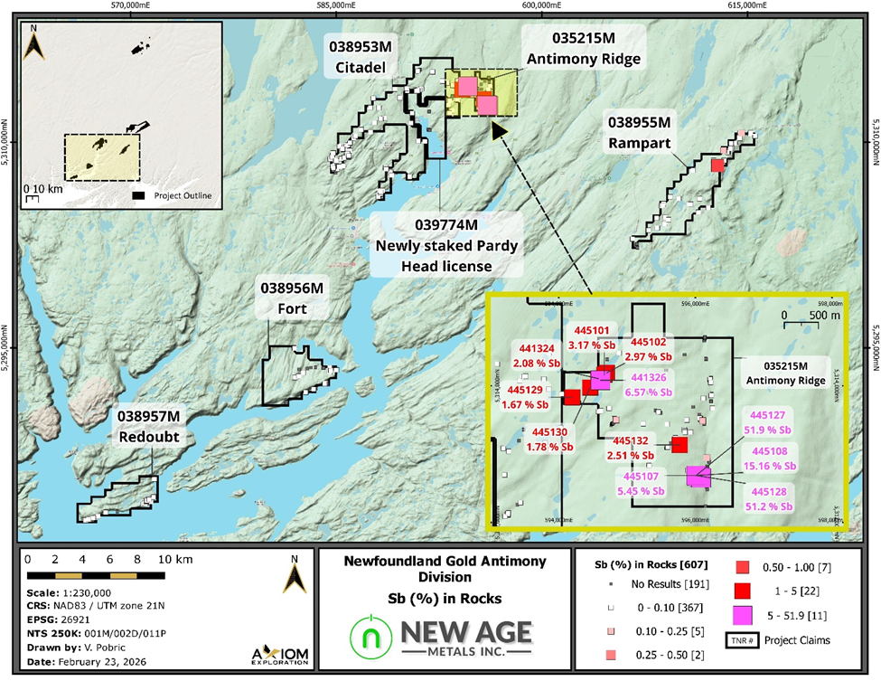 February 27, 2026 – Rockport, Ontario– New Age Metals Inc. (TSX.V: NAM | OTCQB: NMTLF | FSE: P7J) (“NAM” or the “Company”) is pleased to report results from its Phase 2 follow-up exploration program at the Company’s St. Alban’s antimony–gold properties in southern Newfoundland and Labrador.