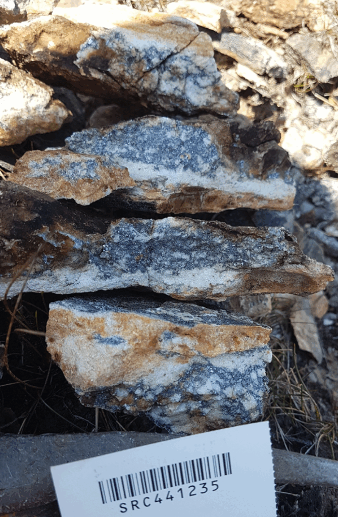 - Fort Property: Located within the Riches Island Formation, the Fort property hosts quartz veins and broad zones of silicification within psammitic rocks. Samples 441234, 441235, and 441236 returned grades up to 29.3% Pb and 131 g/t Ag, with elevated barite. While Pb occurrences were historically documented in the area, these results represent previously undocumented Pb–Ag–Ba occurrences and significantly upgrade the polymetallic potential of the property (Figure 2).