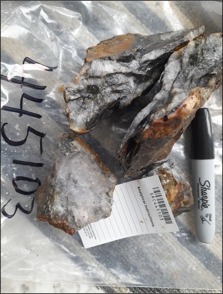Figure 4A. Stibnite-quartz outcrop sample 445102 from Antimony Ridge returned 2.97% Sb.