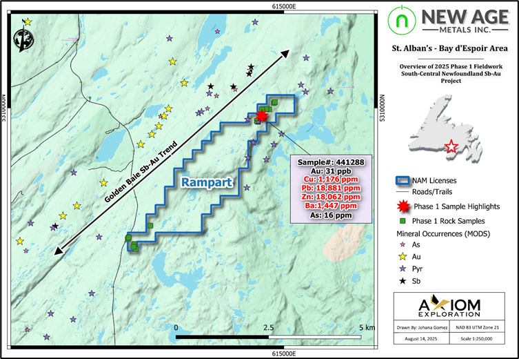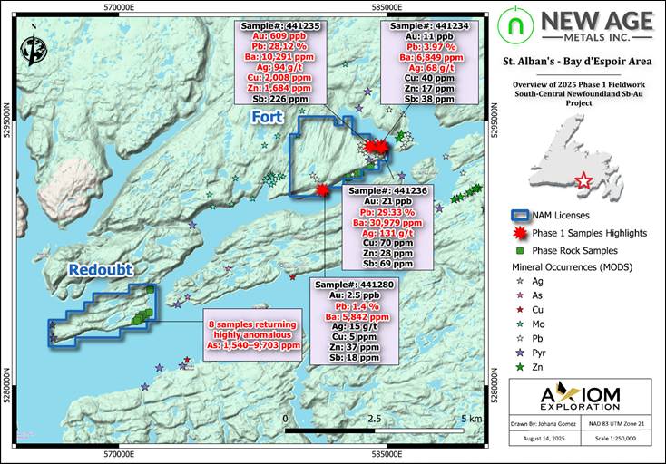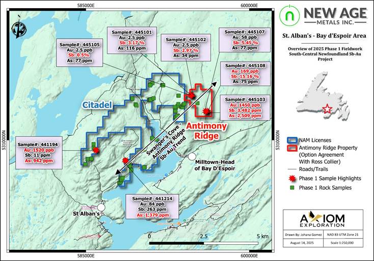 August 27, 2025 – Rockport, Ontario– New Age Metals Inc. (TSX.V: NAM | OTCQB: NMTLF | FSE: P7J) (“NAM” or the “Company”) is pleased to report assay results for antimony (stibnite) and gold mineralized grab samples from the Company’s properties in the Province of Newfoundland and Labrador. A total of 286 grab samples were collected as part of the Phase 1 exploration program in May-June to locate and confirm priority areas of interest for follow-up work during Phase 2 of the exploration program in south-central Newfoundland (for more information, see Company’s recent press releases – click here). Phase 2 exploration work, mainly prospecting and sampling, is currently underway in the St Alban’s area of south-central Newfoundland.
